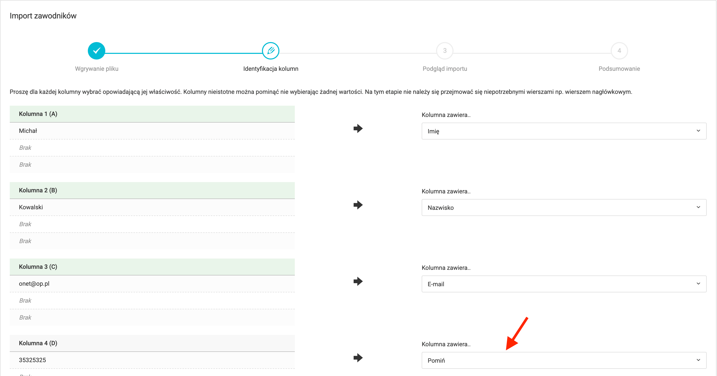 Po wgraniu pliku do systemu, musisz przejść proces identyfikacji kolumn. Polega on przypisania odpowiedniego typu danych do elementu znajdującego się w każdej z kolumn. Na wskazanym obrazku, zidentyfikowałeś już kolumny z imieniem, nazwiskiem oraz adresem e-mail. Do identyfikacji został numer telefon, dlatego też z rozwijanej listy musisz wybrać opcję "telefon". W kolejnym kroku zdecydujesz czy dla tworzonych kont ma zostać wygenerowany login i hasło oraz czy mają zostać utworzone konta opiekunów.